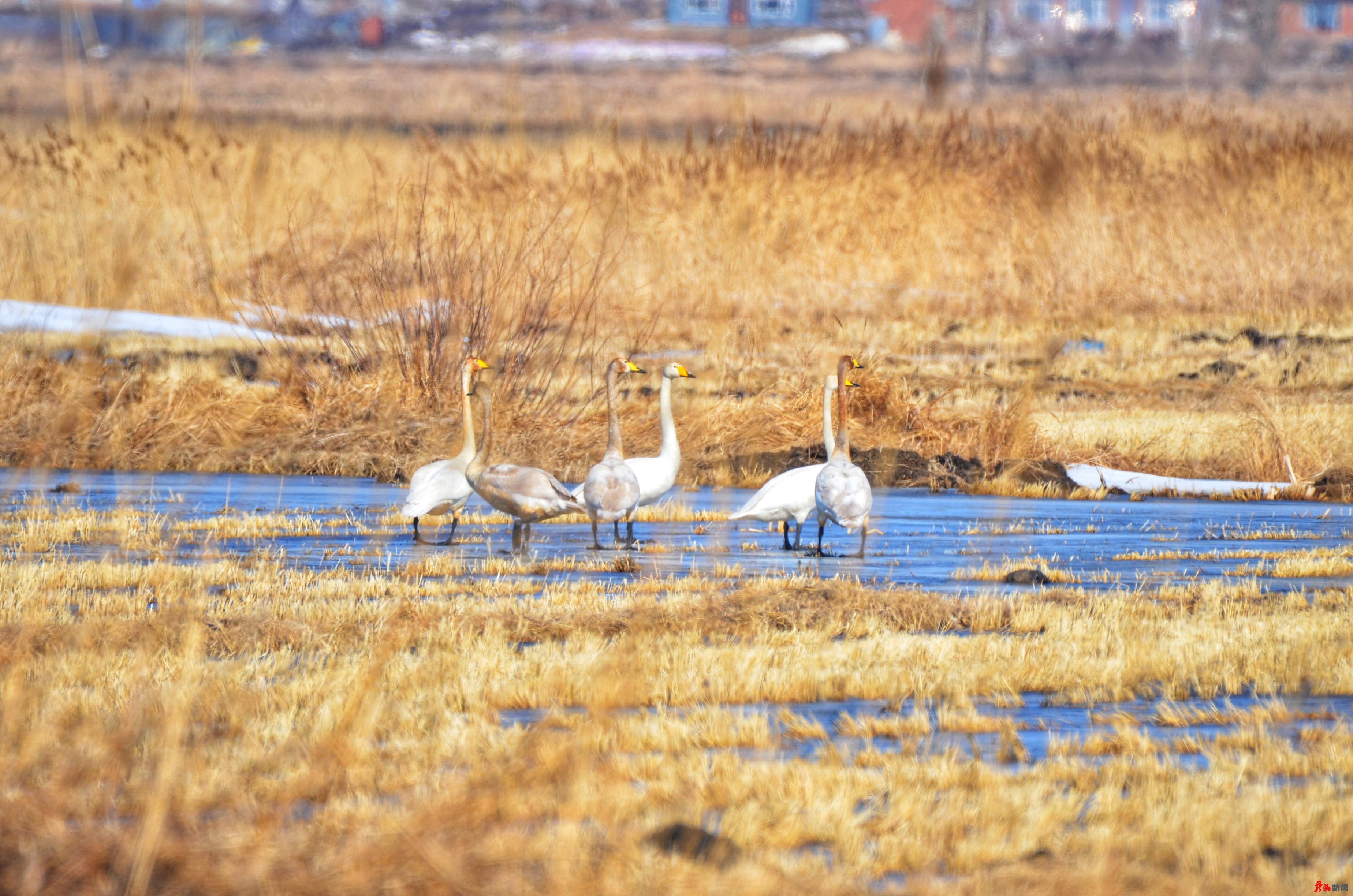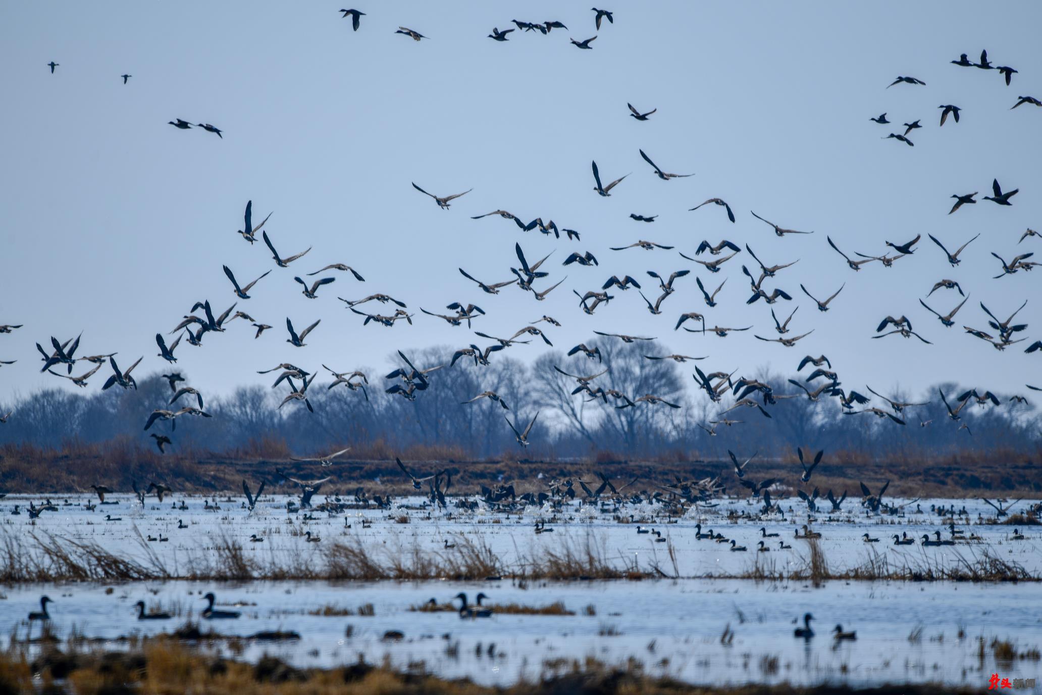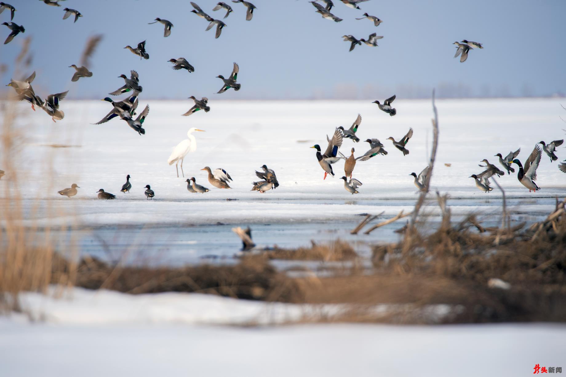 候鳥(niǎo)們有的聚集在剛剛化凍的湖邊,有的聚集在興凱湖閘門流水口附近的活水中,更多的則群集在興凱湖附近的水田地或沼澤地里。