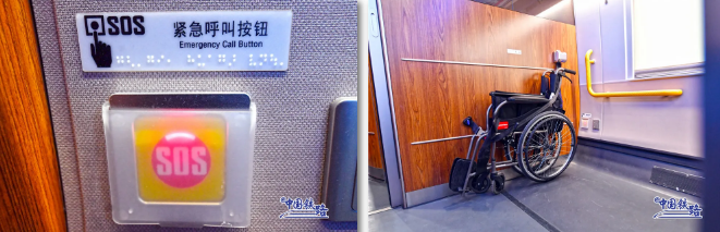全列覆蓋免費(fèi)高速Wi-Fi,旅客在旅行途中可以隨時(shí)使用電腦辦公、手機(jī)娛樂(lè)。車廂內(nèi)設(shè)有大件行李存放處、無(wú)障礙衛(wèi)生間等設(shè)施,并在殘疾人座位區(qū)配備輪椅固定裝置、SOS按鈕等。