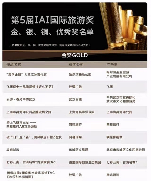 據(jù)了解,IAI國際旅游獎是知名的綜合性廣告與品牌營銷賽事評選,是國際化的旅游營銷及行業(yè)運營評選活動。國內(nèi)眾多營銷及廣告類重量級機(jī)構(gòu)參與角逐,此次組委會共收到779家公司報送的3083件作品及案例,由270多位來自各領(lǐng)域的專家組成的終審團(tuán)進(jìn)行評審。