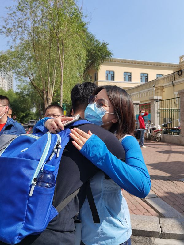 站在學(xué)校門前的哈市第一中學(xué)化學(xué)何老師通過(guò)擁抱為考生助威。