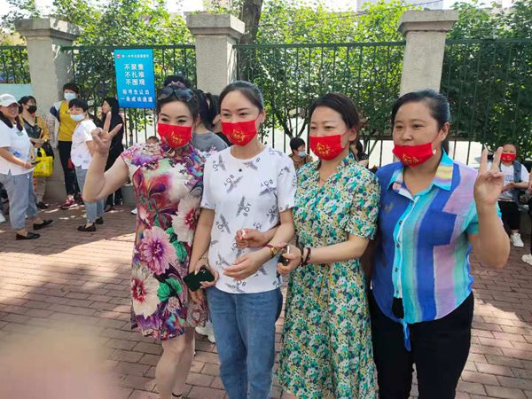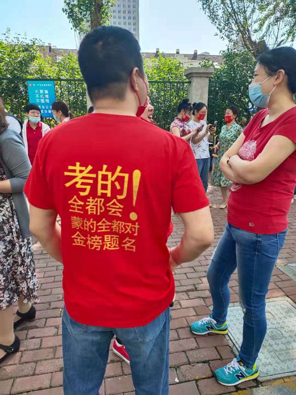 助考媽媽,口罩上的文字為金榜題名,圖左家長(zhǎng)身穿旗袍,寓意旗開(kāi)得勝。