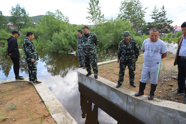 林業(yè)局黨委書記胡守慶(右四)深入汛情現(xiàn)場,查看水位情況。
