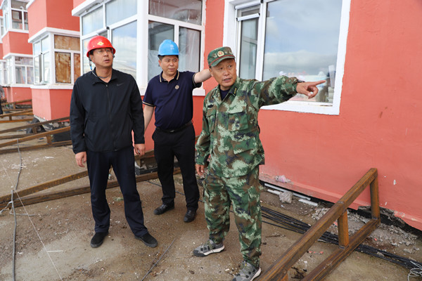 林業(yè)局黨委副書記、局長韓鳳泉(左一)登上莓苑小區(qū)3號樓,了解安裝鐵皮瓦防止一樓漏水情況。
