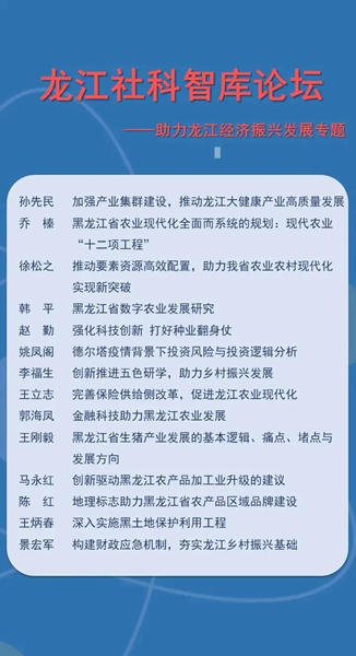 來自省內(nèi)高校、科研院所、企業(yè)的14位專家學者在會上圍繞“助力龍江經(jīng)濟振興發(fā)展”這一主題,分別就“加強產(chǎn)業(yè)集群建設,推動龍江大健康產(chǎn)業(yè)高質量發(fā)展”“黑龍江省農(nóng)業(yè)現(xiàn)代化全面而系統(tǒng)的規(guī)劃:現(xiàn)代農(nóng)業(yè)‘十二項工程’”“推動要素資源高效配置,助力我省農(nóng)業(yè)農(nóng)村現(xiàn)代化實現(xiàn)新突破”“黑龍江省數(shù)字農(nóng)業(yè)發(fā)展研究”等主題進行了發(fā)言。