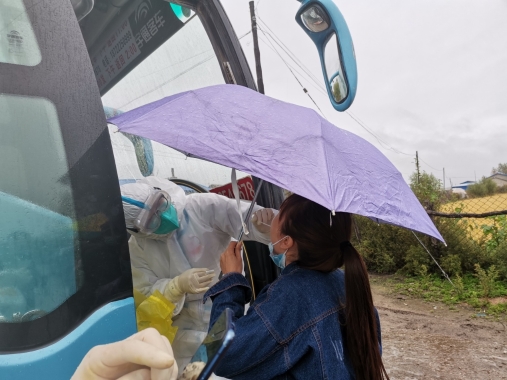 省醫(yī)院南崗院區(qū)中心手術(shù)室護(hù)士趙明裕,中秋節(jié)當(dāng)天下午正在家中給八歲的大女兒過生日,接到通知需要支援巴彥縣核酸采集,親了親身邊的大女兒和四歲的小女兒,立即驅(qū)車前往醫(yī)院。到達(dá)巴彥后,趙明裕被分到后山鄉(xiāng),三人小組同組另兩位隊(duì)員都是年過40歲的大姐,已經(jīng)是預(yù)備黨員的趙明裕想想自己年輕一定要多干些,主動請纓承擔(dān)了更多的工作。當(dāng)天,三人共完成了五個(gè)村屯近600人的采集,外面陰雨綿綿,氣溫驟降,手消涂在手套上,全手掌冰涼的感覺讓趙明裕本就著裝不多的身體愈發(fā)冰冷,但想到臨行前醫(yī)院同事一次次的叮嚀與囑托,她心中堅(jiān)信,抗疫必勝。同時(shí)當(dāng)?shù)卮迕竦臒崆橐沧屭w明裕的心里暖暖的,后山鄉(xiāng)政府的工作人員和人民群眾都非常積極的配合,尤其是老人和小孩,并沒有由于天氣陰雨綿綿的原因而不配合,都在鄉(xiāng)領(lǐng)導(dǎo)的指揮下,井然有序的配合著。