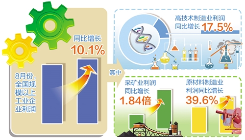 從1月份至8月份累計看,41個工業(yè)大類行業(yè)中,37個行業(yè)利潤總額同比增長,1個行業(yè)扭虧為盈,1個行業(yè)持平,2個行業(yè)下降。其中,石油、煤炭及其他燃料加工業(yè)利潤總額同比增長24.71倍,石油和天然氣開采業(yè)增長2.65倍,有色金屬冶煉和壓延加工業(yè)增長1.78倍,黑色金屬冶煉和壓延加工業(yè)增長1.56倍,化學原料和化學制品制造業(yè)增長1.45倍,煤炭開采和洗選業(yè)增長1.45倍。