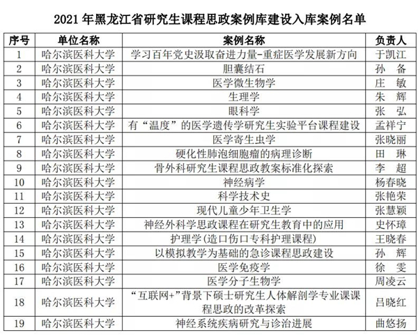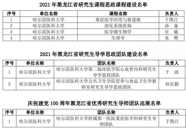 黑龍江經(jīng)濟網(wǎng)訊(黑龍江日報全媒體見習(xí)記者董廣碩 商祺)為貫徹落實國家《關(guān)于全面落實研究生導(dǎo)師立德樹人職責的意見》《高等學(xué)校課程思政建設(shè)指導(dǎo)綱要》《關(guān)于加快新時代研究生教育改革發(fā)展的意見》精神,按照《關(guān)于加快新時代黑龍江省研究生教育改革發(fā)展的實施意見》要求,日前,經(jīng)全省研究生培養(yǎng)單位遴選推薦,黑龍江省研究生課程思政教育聯(lián)盟專家委員會評審,省學(xué)位委員會、省教育廳批準,哈爾濱醫(yī)科大學(xué)共有26個項目獲批省級立項,其中研究生課程思政課程建設(shè)項目4個、研究生導(dǎo)學(xué)思政團隊(導(dǎo)師)建設(shè)項目2個、研究生課程思政案例19個,慶祝建黨100周年巡展優(yōu)秀研究生導(dǎo)師團隊1支。