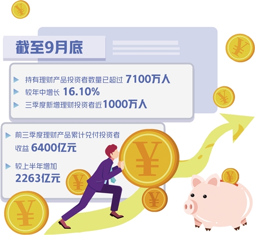 而且,隨著居民財(cái)富的不斷積累,投資者的理財(cái)意識(shí)顯著增強(qiáng),銀行理財(cái)投資者人數(shù)持續(xù)增長(zhǎng),截至9月底,持有理財(cái)產(chǎn)品投資者數(shù)量已超過(guò)7100萬(wàn)人,較年中增長(zhǎng)16.10%,僅三季度新增理財(cái)投資者近1000萬(wàn)人。在轉(zhuǎn)型過(guò)程中,理財(cái)產(chǎn)品的投資收益也穩(wěn)中有升,前三季度理財(cái)產(chǎn)品累計(jì)兌付投資者收益6400億元,較上半年增加2263億元。