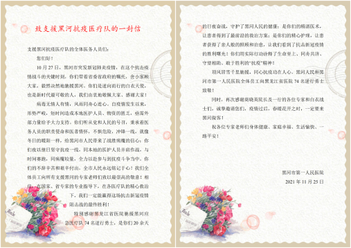 據(jù)介紹,省醫(yī)院支援黑河應(yīng)急醫(yī)療隊共收治新冠肺炎患者69人,其中重癥1例,最小的患者2歲,最大的患者90歲,在兄弟單位接手前,共治愈出院35人。治療期間,醫(yī)療隊收到了多封患者表揚信,小患者們則用畫筆表達了對天使們的感謝與敬仰,有的未出院患者聽說省醫(yī)院醫(yī)療隊要離開了,都依依不舍,紛紛表達對醫(yī)療隊精湛的醫(yī)技和暖心醫(yī)療的感謝。