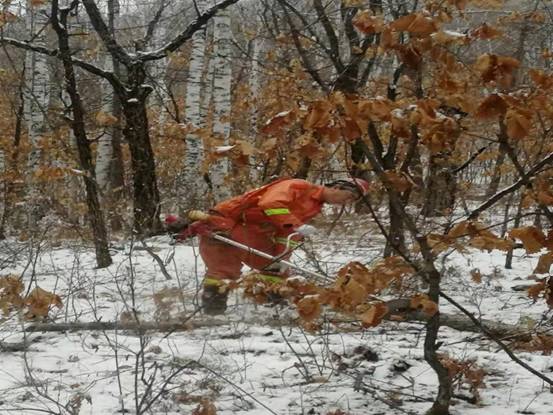 在經(jīng)過一段緊張嚴(yán)格的產(chǎn)前技能及安全培訓(xùn)后,紅星林場職工們備齊生產(chǎn)工具和防護(hù)物品,每天頂著未褪盡的夜色出發(fā),天剛冒亮就開工,在積雪覆蓋的林間不停穿行,鋸手手持割灌機把作業(yè)規(guī)程要求的各類林內(nèi)枯死、風(fēng)折枝干伐除,后面的歸堆工緊隨其后,把割下的枯干枝條有序的理順碼成堆。各小組分工明確,配合嫻熟,漫山雜亂的倒木藤條在工人們的手下被梳理的清晰利落,寂靜的山林也在機器的轟鳴和工人們的笑聲中熱鬧起來。