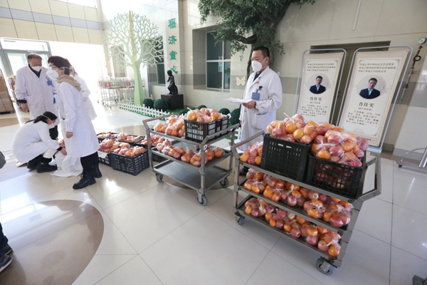 黑龍江經(jīng)濟網(wǎng)訊(魏然 李麗 祝東 梁新立) 12月7日,在哈爾濱醫(yī)科大學(xué)附屬哈爾濱兒童醫(yī)院,30箱總重700多斤的蘋果和桔子,被一箱箱運進住院處病房,由行政后勤人員送到每個病房患兒家庭手中,讓在院的孩子們補充營養(yǎng)。