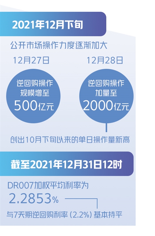 從2021年12月20日開始,公開市場(chǎng)操作力度就逐漸加大,主要表現(xiàn)為單日逆回購操作規(guī)模從之前的100億元增至200億元,并重啟14天期逆回購操作,與7天期品種形成搭配。進(jìn)入2021年最后一周,12月27日逆回購操作規(guī)模增至500億元,12月28日逆回購操作進(jìn)一步加量至2000億元,創(chuàng)出10月下旬以來的單日操作量新高。