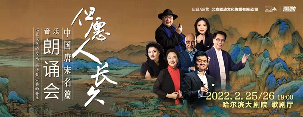 2月25、26日,“但愿人長(zhǎng)久——中國(guó)唐宋名篇音樂(lè)朗誦會(huì)”將以全新陣容再度亮相冰城舞臺(tái),由指揮家高嵩執(zhí)棒,黑龍江省歌舞劇院有限公司交響樂(lè)團(tuán)、民族樂(lè)團(tuán)、合唱團(tuán)共同呈現(xiàn),朗誦表演藝術(shù)家濮存昕、喬榛、張晶、張宏聯(lián)袂著名歌唱家楊小勇、么紅,以詩(shī)樂(lè)相伴的方式再現(xiàn)盛唐兩宋的詩(shī)詞歌賦。