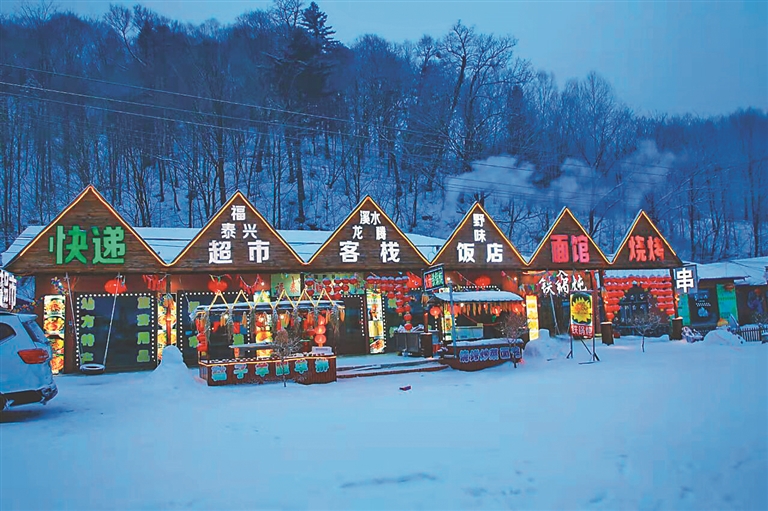 當(dāng)我們抵達(dá)雪谷的時(shí)候,暮色已濃,天地間覆蓋了一片黑色的幕布。但雪谷中心街道上,聳立著由上千只大紅燈籠排列組合的拱形門,燈火輝煌,延續(xù)百米開外。門的頂端中央鑲嵌著“中國雪谷”四個(gè)金色大字,格外醒目。我們停下車拍照,并就近住宿,溫暖的火炕讓我們很快進(jìn)入夢(mèng)鄉(xiāng)。