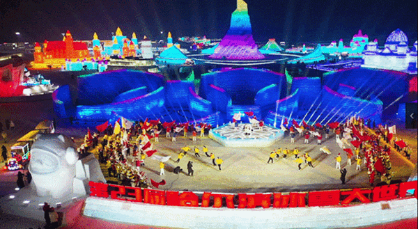 在30分鐘的暖場表演中,黑龍江哈爾濱、新疆阿勒泰、江蘇南京、廣東深圳等地舉行了慶祝活動,并以連線的方式與暖場演出進(jìn)行互動。其中,哈爾濱的互動表演節(jié)目現(xiàn)場,選在了被譽(yù)為“黑龍江冰雪旅游名片”的哈爾濱冰雪大世界。
