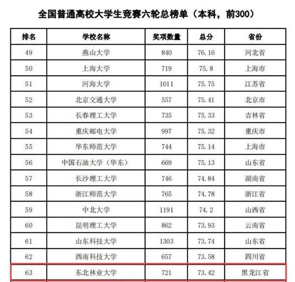 據(jù)悉,中國高等教育學(xué)會自2017年2月啟動《高校競賽評估與管理體系研究》項目以來,中國高等教育學(xué)會已經(jīng)連續(xù)發(fā)布六輪榜單,這是我國第一個專注高校創(chuàng)新人才培養(yǎng)暨學(xué)科競賽成果的排行榜,是檢驗高校人才培養(yǎng)質(zhì)量的重要途徑。為從更長的時間段了解各高校大學(xué)生競賽發(fā)展態(tài)勢,特在今年發(fā)布了“六輪總榜單”,時間跨度從2012年到2021年,東北林業(yè)大學(xué)以總分73.42,位列全國第63位。