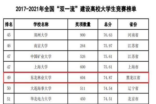 黑龍江經(jīng)濟網(wǎng)訊(黑龍江日報全媒體見習(xí)記者董廣碩 商祺)近日,中國高等教育學(xué)會高校競賽評估與管理體系研究工作組發(fā)布2021全國普通高校大學(xué)生競賽分析報告,在《2017-2021年農(nóng)林類本科院校大學(xué)生競賽排行榜TOP20》中。東北林業(yè)大學(xué)以總分74.87(獲獎604項)的優(yōu)異成績連續(xù)四年蟬聯(lián)榜首。