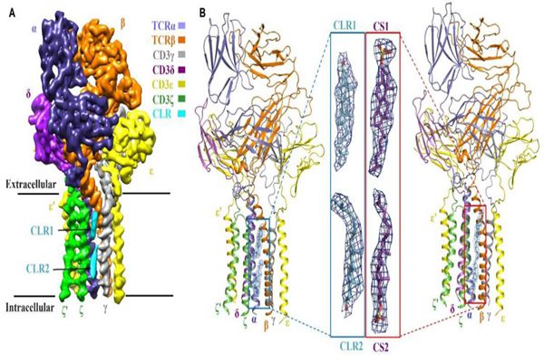 T細胞是脊椎動物適應性免疫的重要細胞,在病毒感染、癌癥以及自體免疫疾病中起著關鍵作用。T細胞通過其TCR-CD3受體復合物特異性識別抗原,將胞外的抗原識別信號跨膜傳遞到T細胞內,激活胞內的適應性免疫信號通路,啟動免疫反應。2019年,該課題組在《自然》(Nature)上發(fā)表了題為“人T細胞受體-共受體復合物組裝的結構基礎”(Structural basis of assembly of the human TCR-CD3 complex)的研究文章,首次解析了人T細胞受體復合物(包含全部8個亞基)的高分辨率冷凍電鏡結構,揭示了TCR-CD3亞基在膜外側以及膜內識別、組裝成功能復合物的分子機制。但一直以來,T細胞受體如何將胞外抗原信號傳遞到胞內激活T細胞的這一關鍵機制的結構基礎并不清楚。