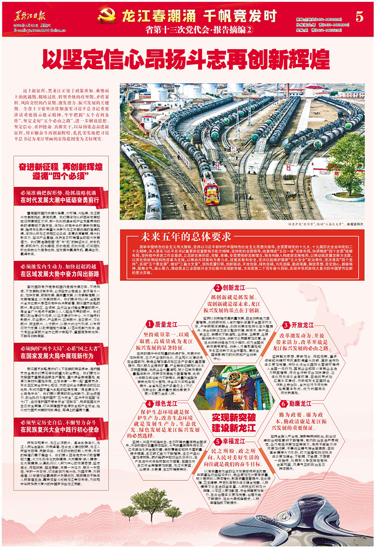 邁上新征程,黑龍江正處于政策疊加、乘勢而上的機(jī)遇期,爬坡過坎、轉(zhuǎn)型升級的攻堅(jiān)期,矛盾累積、風(fēng)險(xiǎn)交織的凸顯期,激發(fā)潛力、振興發(fā)展的關(guān)鍵期。全省上下要堅(jiān)決貫徹落實(shí)習(xí)近平總書記重要講話重要指示批示精神,牢牢把握“五個(gè)有利條件”,堅(jiān)定走好“五個(gè)必由之路”,進(jìn)一步解放思想、堅(jiān)定信心、勇?lián)姑⒄孀?shí)干,以昂揚(yáng)姿態(tài)奮進(jìn)新征程,用不懈奮斗再創(chuàng)新輝煌,扎扎實(shí)實(shí)地把習(xí)近平總書記為龍江擘畫的宏偉藍(lán)圖變?yōu)槊篮矛F(xiàn)實(shí)。
