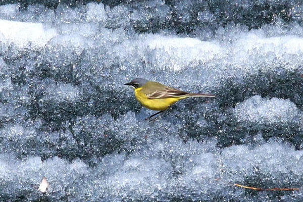 黃鹡鸰在冰面上尋覓、等待另一半(王力 攝)