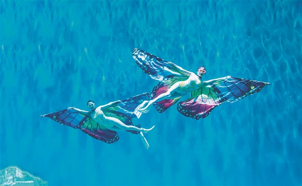 哈爾濱極地公園的水舞秀表演會(huì)聚國內(nèi)頂級(jí)水舞表演藝術(shù)家,汲取花樣游泳、芭蕾舞、形體藝術(shù)的精華。演員不僅需要克服6米深海水的巨大浮力,還要克服相當(dāng)于陸地上12倍的巨大阻力,在0.5秒內(nèi)展開4米長的巨大蝴蝶羽翼,閉氣空潛3分鐘,完成一系列“蝶舞”動(dòng)作,難度極高!炫彩的羽翼、波光粼粼的海水、五彩斑斕的魚兒融合在一起,美輪美奐。
