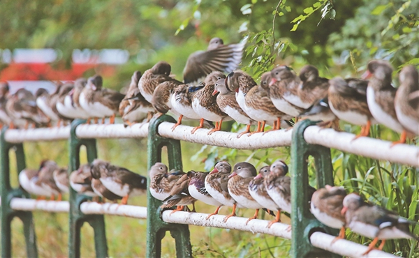 13日,哈爾濱市兆麟公園鴛鴦湖邊,近300只野生鴛鴦在湖邊欄桿上休息,密密麻麻排出近百米的“長(zhǎng)龍”。公園專(zhuān)職看護(hù)鴛鴦的職工車(chē)春虎介紹,目前在公園內(nèi)及周邊出生的小鴛鴦已經(jīng)長(zhǎng)大,加上從周邊濕地飛來(lái)的鴛鴦,每天早晚來(lái)鴛鴦湖覓食的鴛鴦數(shù)量接近300只,這一數(shù)量還在持續(xù)增長(zhǎng)。“預(yù)計(jì)國(guó)慶節(jié)前后,數(shù)量能超400只?!?/span>