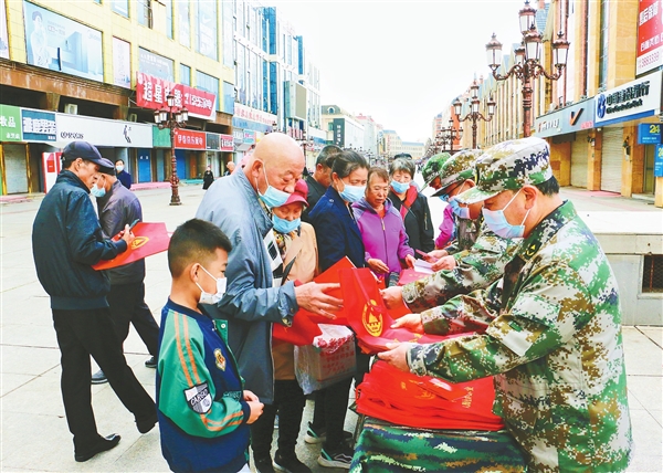 在伊美區(qū)步行街活動現(xiàn)場,市人防辦工作人員向市民發(fā)放宣傳單和宣傳手冊(郭強(qiáng)/攝)。