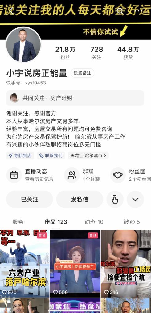 “松北這個小區(qū),現(xiàn)房7000起步”、“這里是江南核心商業(yè)圈,通勤便利”、“這可以說是哈爾濱二環(huán)旁配套設施最全的樓盤”……晚上8點,每當夜幕降臨,房產(chǎn)主播小宇(快手ID:xysf0453)會準時出現(xiàn)在快手平臺直播間,為廣大有購房需求的客戶答疑解惑。