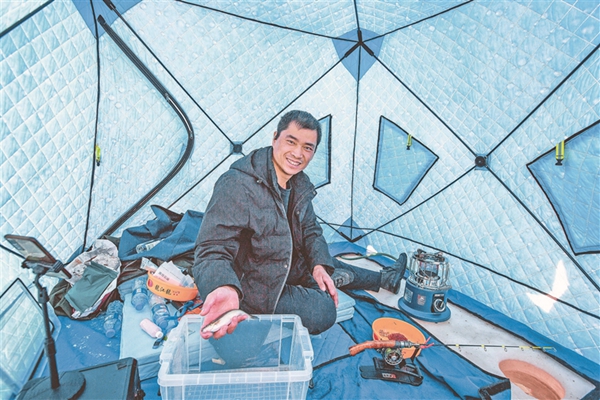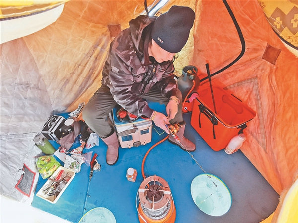 比賽現(xiàn)場,冰面上色彩各異的帳篷錯落排開,來自我省東部地區(qū)多個地市的70名釣魚愛好者聚集在此,感受垂釣魅力。當(dāng)日室外最低溫度零下20℃,而冰釣帳篷內(nèi)卻是熱氣騰騰。選手們用小火爐取暖,調(diào)料、打窩,各展技藝,不一會兒都收獲頗豐。