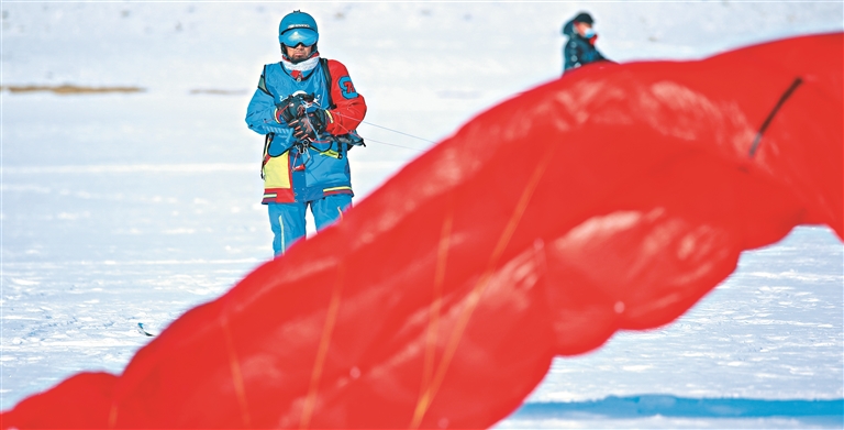 近日,第六屆風(fēng)箏滑雪公開賽在松花江上舉行,幾十位選手在白雪皚皚的江上競速馳騁。大風(fēng)箏帶著雪板高速駛過,時不時濺起朵朵白雪,宛如在雪上“沖浪”。本次比賽地點位于哈爾濱市呼蘭區(qū)附近江面,此處寬闊平坦,且雪質(zhì)佳,極適宜風(fēng)箏滑雪運動。
