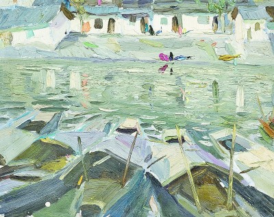 在諶北新的代表性作品里,無論何種結(jié)構(gòu),色調(diào)、筆觸、造型、線條都可以獨(dú)立觀賞。一塊厚堆的白色顏料,可以是云朵、是白墻,或是前后重疊的船帆。用筆的疏密、狀貌和節(jié)奏都有獨(dú)立存在的意義,既可以像欣賞書法用筆一樣拋開物象去體味,又可以去想象和填補(bǔ)與之恰合的物象和自然關(guān)系。諶北新對(duì)書法的深入研究和長期的繪畫寫生,以及他對(duì)物象、空間、色彩關(guān)系的觀察與創(chuàng)造實(shí)踐,使其作品能夠?qū)⒉煌谋憩F(xiàn)手法有機(jī)地融為一體。比如一筆畫下去,既表現(xiàn)空間層次,也體現(xiàn)厚薄輕重,同時(shí)展現(xiàn)光線的微妙變化。這種綜合性的呈現(xiàn)效果,實(shí)際上也契合著中國山水畫所追求的通過用筆的輕重緩急,通過虛實(shí)濃淡的墨色渲染,通過遠(yuǎn)近高低的畫面布局,表現(xiàn)山水對(duì)人的情感與心靈的影響。而諶北新的風(fēng)景油畫,正是基于中國人對(duì)山川草木的喜愛之情,通過體察和探求提煉出的獨(dú)特意象,它符合現(xiàn)代人的心理需求,也呼應(yīng)著畫家畢生追求的藝術(shù)境界——須其自來,不以力構(gòu)。