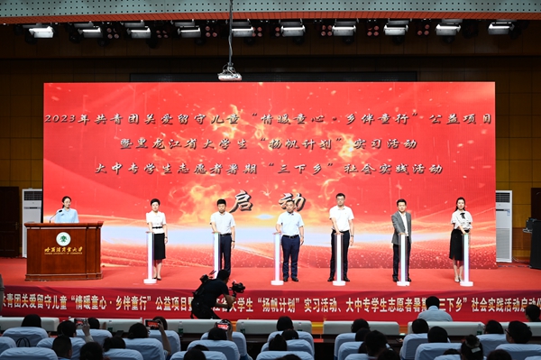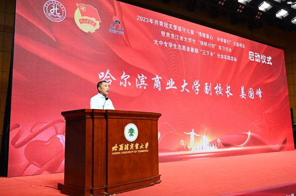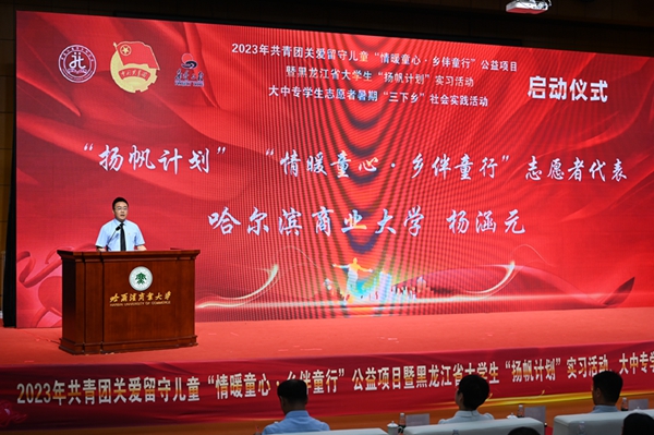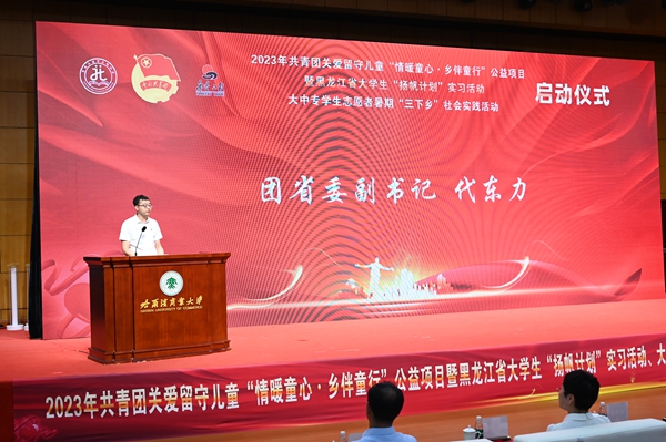 本次活動,在哈爾濱商業(yè)大學(xué)的大力支持下順利開展,哈爾濱商業(yè)大學(xué)副校長姜國鋒在儀式上致辭,他說:“學(xué)校建校71年來,立足立德樹人根本任務(wù),聚焦‘為黨育人,為國育才’的職責(zé)使命,在不斷加強‘第一課堂’建設(shè)的同時,還依托學(xué)?!惑w兩翼’文化育人模式,充分發(fā)揮實踐育人的作用,通過開展‘三下鄉(xiāng)’‘返家鄉(xiāng)’等社會實踐和‘西部計劃’‘興邊富民’志愿服務(wù)項目,引導(dǎo)廣大青年學(xué)生堅持用習(xí)近平新時代中國特色社會主義思想凝心鑄魂,在社會的課堂中‘受教育、長才干、作貢獻(xiàn)’?!被顒蝇F(xiàn)場,播放《黑龍江省希望工程30年與光同行》和黑龍江省大中專學(xué)生志愿者暑期“三下鄉(xiāng)”社會實踐活動宣傳片,與會領(lǐng)導(dǎo)上臺共同啟動了“情暖童心·鄉(xiāng)伴童行”公益項目、大學(xué)生“揚帆計劃”實習(xí)活動、大中專學(xué)生志愿者暑期“三下鄉(xiāng)”社會實踐活動。