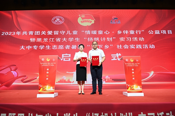 黑龍江經(jīng)濟網(wǎng)訊(王丹陽 記者祝東)7月5日,2023年共青團關(guān)愛留守兒童“情暖童心·鄉(xiāng)伴童行”公益項目暨黑龍江省大學(xué)生“揚帆計劃”實習(xí)活動、大中專學(xué)生志愿者暑期“三下鄉(xiāng)”社會實踐活動啟動儀式在哈爾濱商業(yè)大學(xué)隆重舉行。共青團黑龍江省委副書記代東力、陳海平,哈爾濱商業(yè)大學(xué)副校長姜國峰,省直機關(guān)團工委書記趙明瑞,黑龍江省人力資源和社會保障廳、省知識產(chǎn)權(quán)局、省人民檢察院、省青少年發(fā)展基金會、哈爾濱市南崗區(qū)民政局、哈爾濱海關(guān)、哈爾濱海事局相關(guān)領(lǐng)導(dǎo),以及哈爾濱商業(yè)大學(xué)的志愿者和哈爾濱市樂業(yè)小學(xué)師生代表參加本次活動。