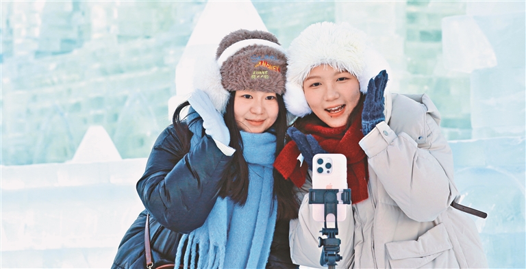 園區(qū)內(nèi)人氣火爆。大大小小的冰雪景觀姿態(tài)各異、美不勝收。游玩拍照、直播互動(dòng)、品嘗美食……在這座冰雪奇幻王國里,游客盡情體驗(yàn)著冰雪帶來的別樣快樂。