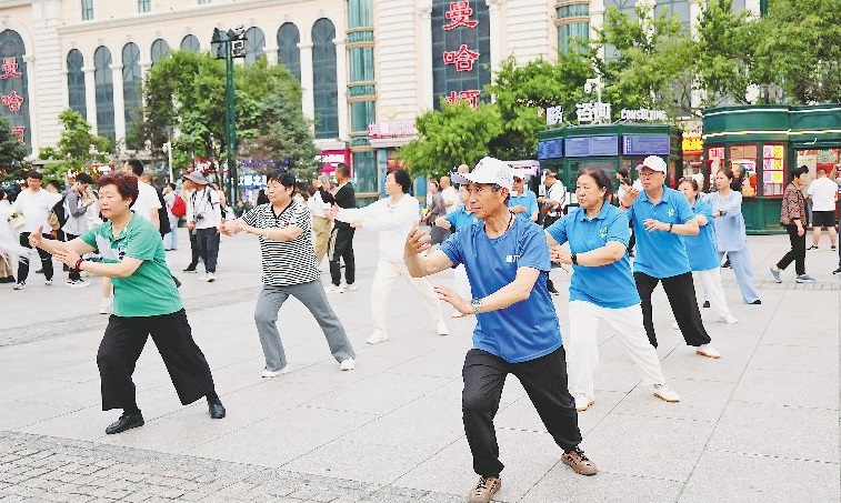 在哈爾濱建筑藝術(shù)廣場上,可以看到來自各地的游人正在打卡拍照,來自青島的老年旅游團還在此打起了太極拳。據(jù)同程旅行發(fā)布的《2024暑運出行趨勢報告》,自6月份以來,哈爾濱成為這個暑期熱門避暑目的地,6月中旬開始,黑龍江的人氣快速上升。本報記者 張澍攝