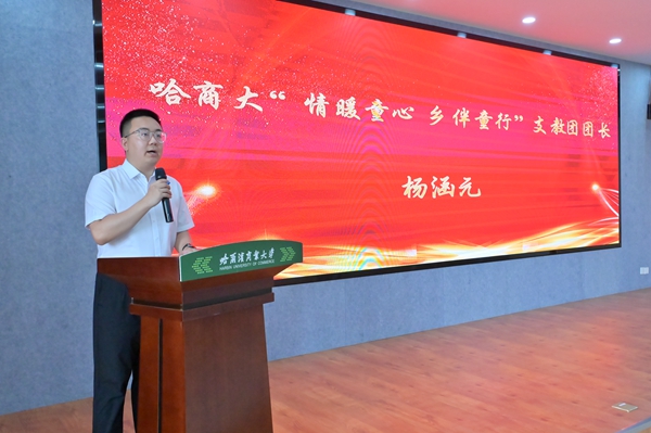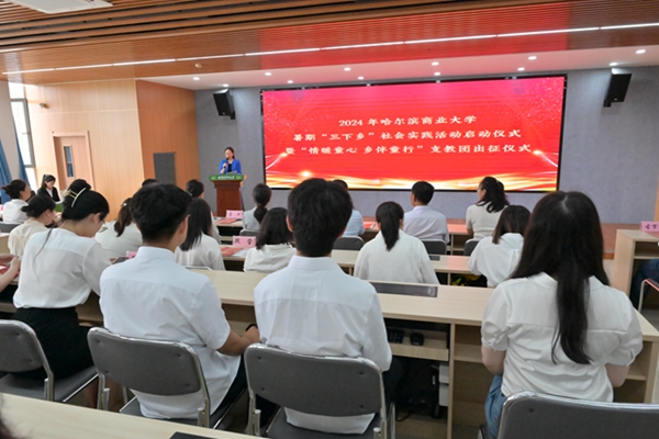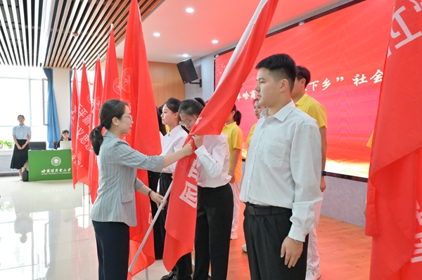 省希望工程捐助中心主任、省青少年發(fā)展基金會理事長杜晶為哈爾濱商業(yè)大學(xué)2024年“三下鄉(xiāng)”社會實踐團(tuán)隊代表、“情暖童心·鄉(xiāng)伴童行”支教團(tuán)代表授旗,希望即將奔赴龍江大地的志愿者們能夠充分利用服務(wù)期,向下扎根、向上生長,踐行志愿服務(wù)精神,在奉獻(xiàn)與收獲中積累報國為民的樸素情懷,做有理想、有擔(dān)當(dāng)?shù)男聲r代青年。