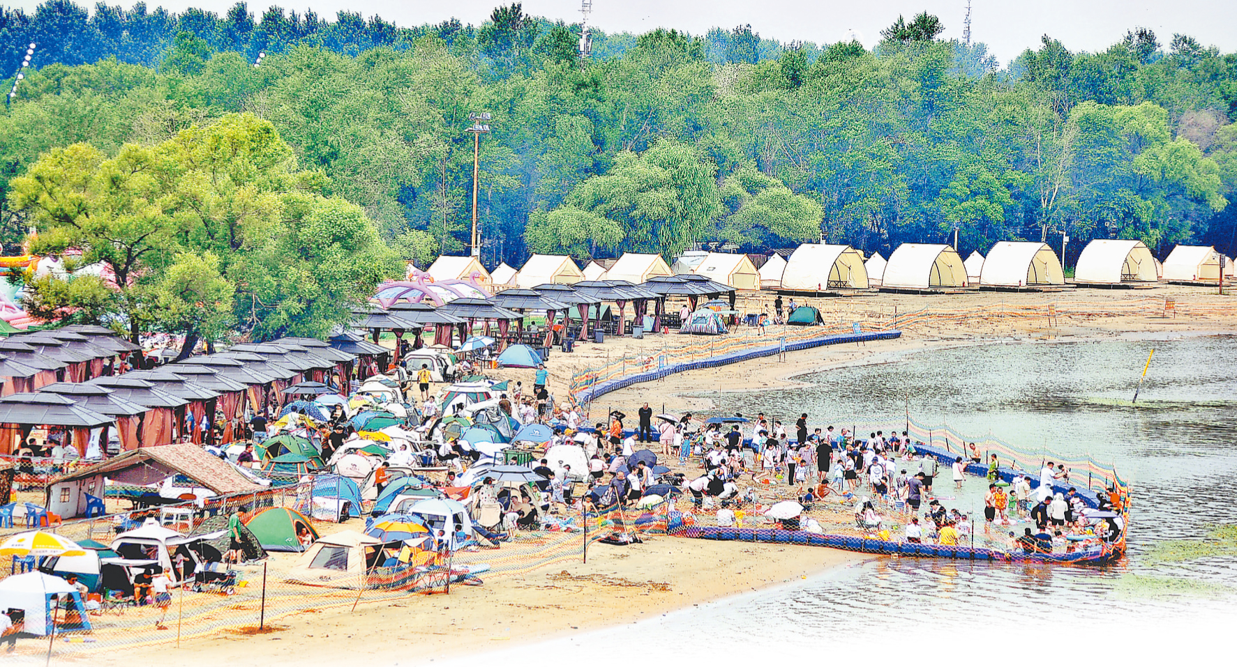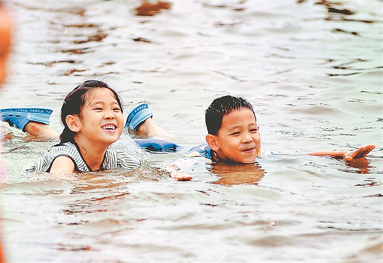 日前,哈爾濱市江北公路大橋附近的公益沙灘浴場內(nèi),許多市民帶著孩子在戲水納涼。這處沙灘浴場面積有數(shù)百平方米,水中最深處只有半米多,周圍設置了隔離帶、安全網(wǎng)。孩子們盡情玩樂,有的在學游泳、有的玩水槍、有的在堆沙子、有的在挖“水渠”,叫喊聲、歡笑聲不絕于耳。
