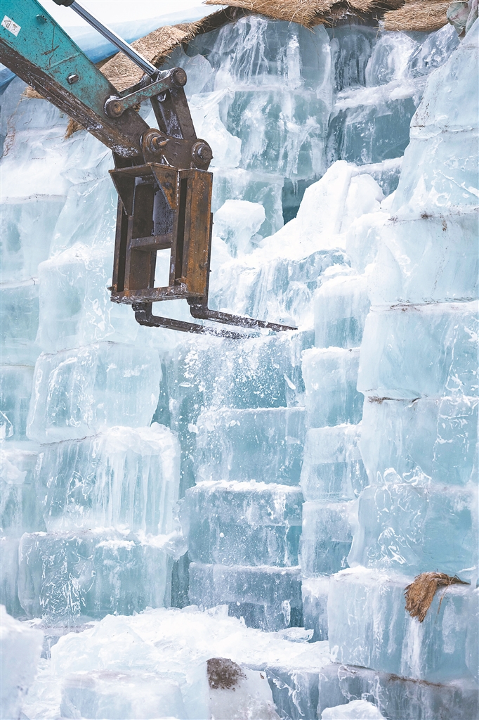在哈爾濱冰雪大世界存冰場,大量保存完好的冰體整齊堆疊,十分壯觀。冰垛之間,吊車、叉車、鏟車、卡車等穿行往返、有序作業(yè),一派熱火朝天的忙碌景象。