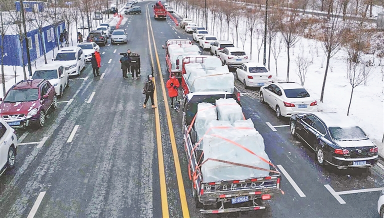 為保證冰建景觀的“高顏值”,這些存冰在啟用后,要先送往驗冰場接受檢查,檢查冰體的厚度、長度、完整度和潔凈度,只有品相好、品質佳并符合建筑要求標準的合格冰體,才能進入園區(qū)用于景觀建設。