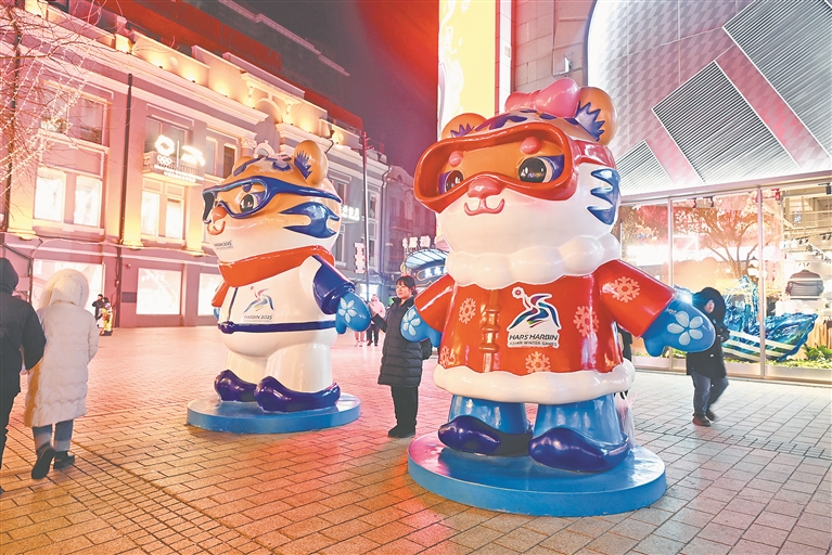 隨著亞冬會的腳步越來越近,哈爾濱市的大街小巷,隨處可見亞冬會元素,吉祥物“濱濱”和“妮妮”在街頭一直是游客和市民的萌寵。