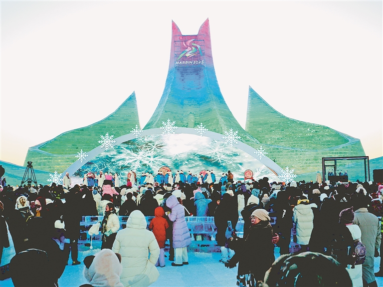 精美與靈動相互交織,園區(qū)內(nèi)亞冬會氛圍濃厚?!拔覀冊趫@區(qū)內(nèi)看到很多亞冬會元素的冰雪景觀,像雪雕‘濱濱’‘妮妮’、會徽大地景觀等,準備逐個打卡。”山東游客許多開心地說。