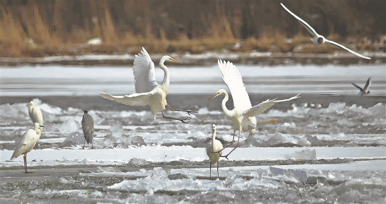 冰排流動,數(shù)百只鷺鳥羽翅翻飛,鳴聲陣陣,此時的松花江一派生機勃勃的景象。