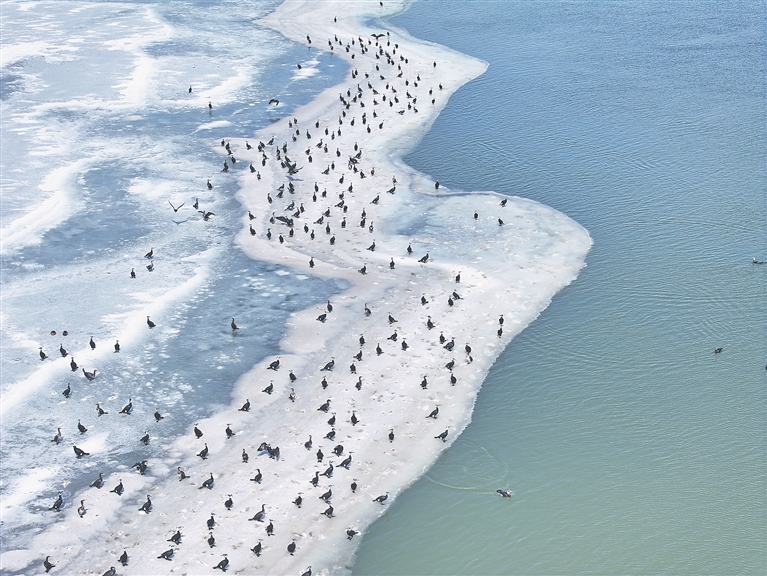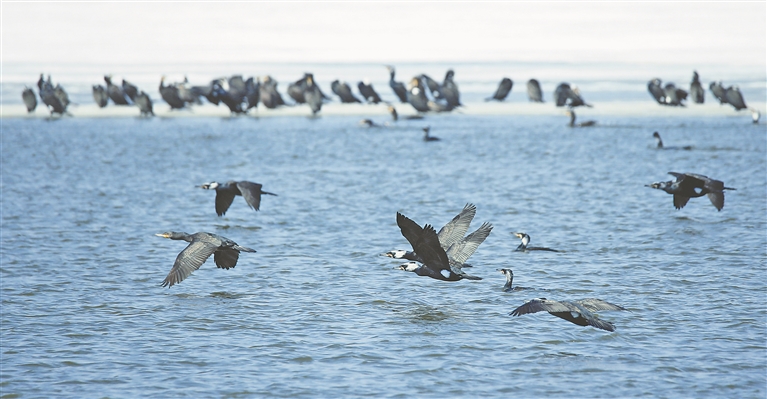 近日,松花江哈爾濱段出現(xiàn)大群的鸕鶿,它們?cè)诒诘乃苫ń暇墼谝黄穑^察著江面魚(yú)類的蹤跡,一旦發(fā)現(xiàn)魚(yú)群,近千只鸕鶿就快速游過(guò)去,潛水捕起“開(kāi)江魚(yú)”。