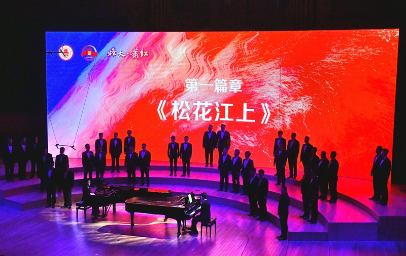第一篇章《松花江上》以《長城謠》的泣血鄉(xiāng)愁與《義勇軍進(jìn)行曲》的全場肅立高唱,訴盡抗戰(zhàn)時期的流亡之痛與民族豪情,更創(chuàng)新植入“童年、少女、青年”三代“蕭紅”扮演者(張舒涵、鄭楚琪、尤泓斐)與合唱團(tuán)的情景互動。第二篇章《抗戰(zhàn)的烽火》中,《五月的鮮花》《露營之歌》《保衛(wèi)黃河》等作品以合唱與立體站位,緬懷趙一曼、楊靖宇等英烈,再現(xiàn)全民抗戰(zhàn)的壯闊圖景。第三篇章《文脈永續(xù)》則通過魯迅、茅盾等文學(xué)名家對蕭紅的評價、跨年代讀者代表致敬及《致祖國》的磅礴合唱,彰顯其文學(xué)精神在新時代的傳承。