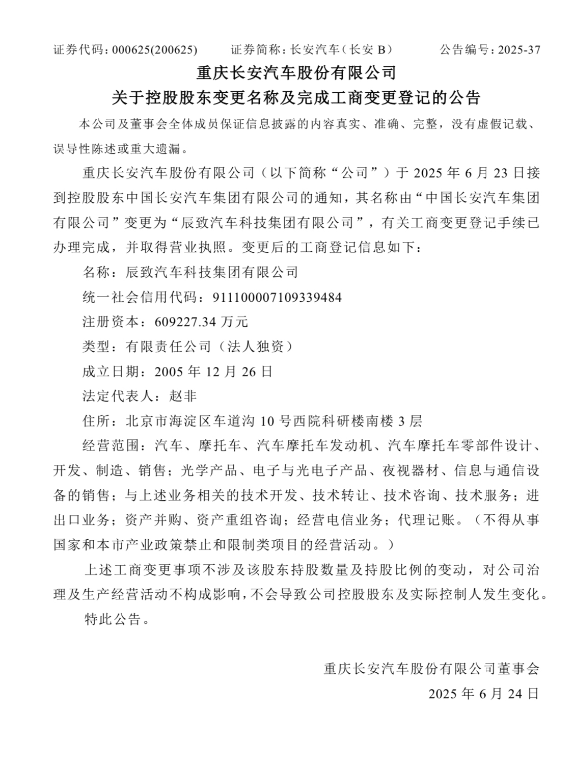 6月23日晚間,重慶長安汽車股份有限公司(以下簡稱“長安汽車”;000625)發(fā)布公告稱,公司接到控股股東中國長安汽車集團(tuán)有限公司通知,其名稱由“中國長安汽車集團(tuán)有限公司”變更為“辰致汽車科技集團(tuán)有限公司”,并已完成工商變更登記手續(xù)。