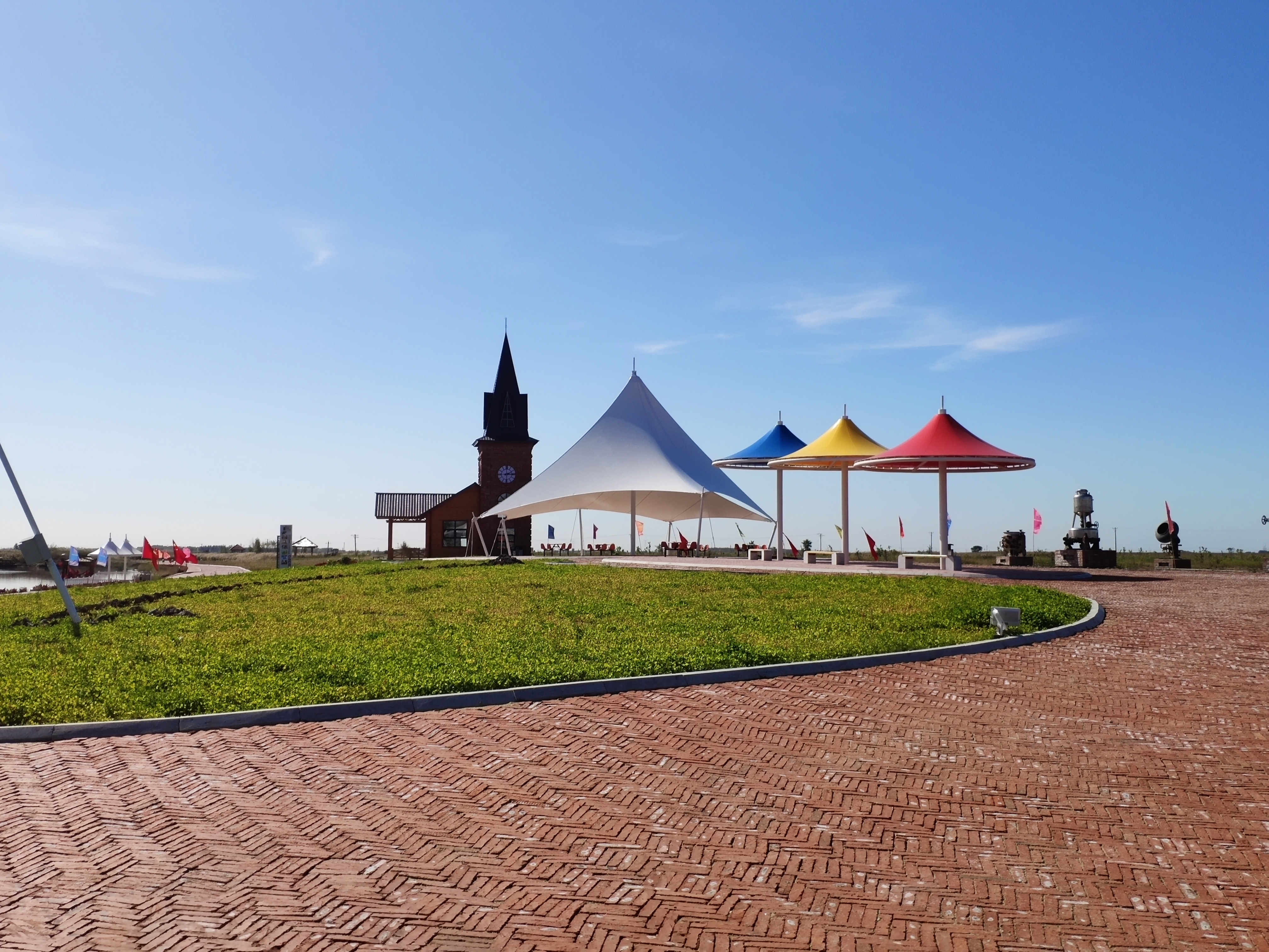 傳統(tǒng)文化廣場以金代文化為主題,廣場中央矗立著仿古城墻雕塑,兩側(cè)設有民俗展覽館,仿古建筑群與小橋流水相映成趣。休閑廣場以現(xiàn)代簡約風格設計,配備智能健身器材和兒童游樂區(qū),設有秋千群、帳篷營地,家庭游客可在此野餐、嬉戲。而在位于濕地制高點的觀景廣場,可俯瞰湖光山色。夕陽西下時,霞光與候鳥齊飛,成為網(wǎng)紅打卡點。