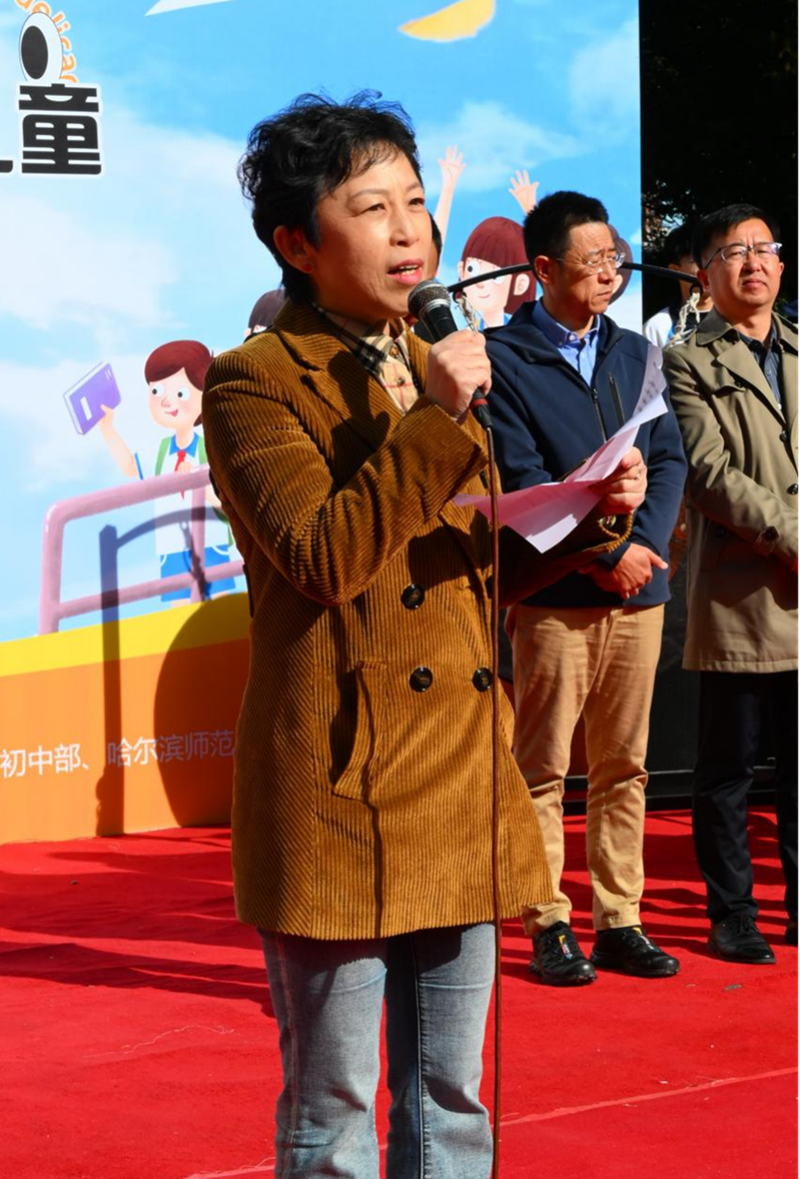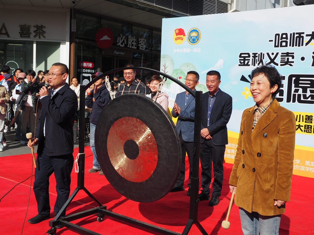 受贈(zèng)方香坊區(qū)幸福鎮(zhèn)哈藥希望小學(xué)校長劉壯現(xiàn)場(chǎng)介紹了這所希望小學(xué)留守兒童的情況。開幕式最后,黃磊理事長和張靜萍書記一同敲響大鑼,鳴鑼開市。