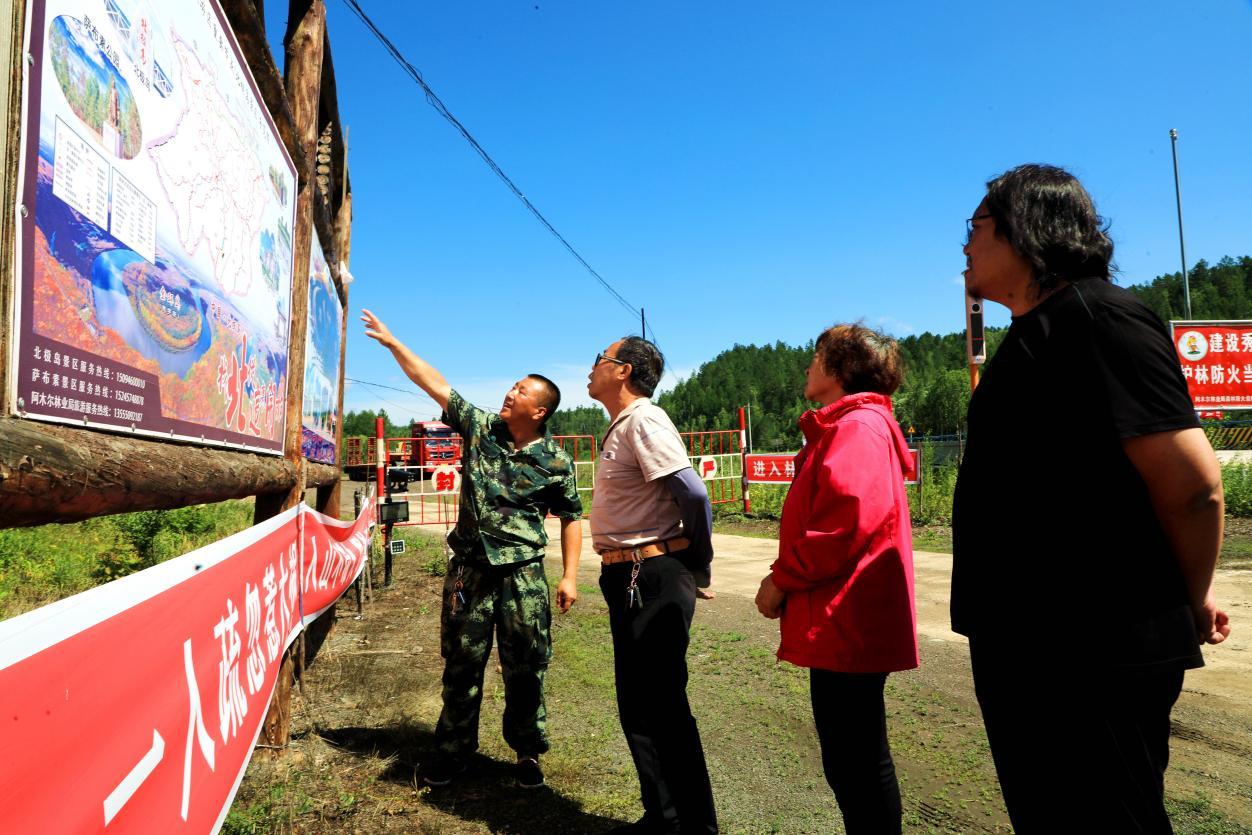 阿木爾林業(yè)局1—21線管護(hù)員李瑞向游客介紹旅游景點(王力 攝)