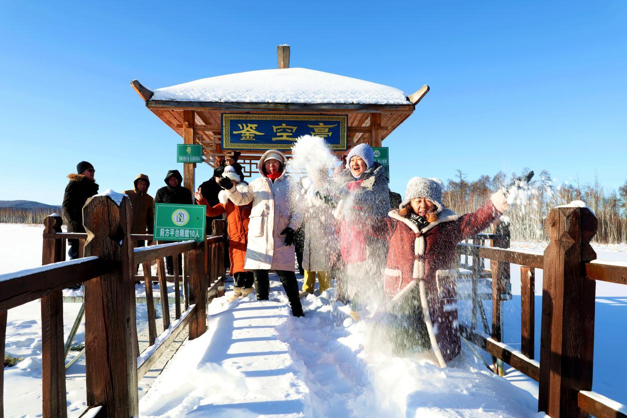 黑龍江省詩詞協(xié)會采風(fēng)團成員在雙妃湖親身感受冰雪文化和驛站文化(王力 攝)