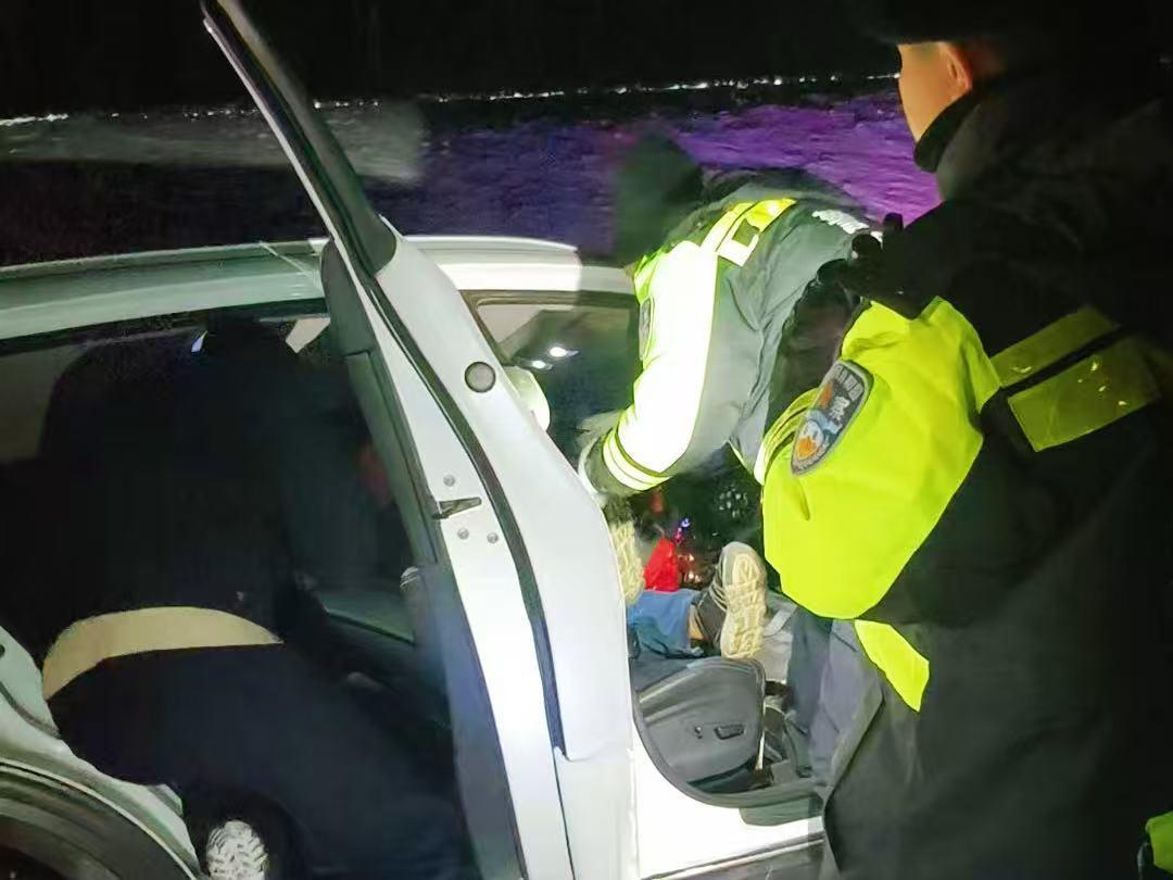抵達(dá)現(xiàn)場后,民輔警第一時間查看被困人員狀態(tài),通過簡單詢問,確認(rèn)無人員受傷,隨即立刻展開低溫救援,由于溝坡陡滑,常規(guī)救援設(shè)備無法使用。民輔警毫不猶豫地滑下溝底,并迅速從副駕駛展開救援,經(jīng)過不懈努力,十分鐘后成功將被困人員從車內(nèi)救出。隨后,民輔警主動幫助聯(lián)系拖車公司將車輛送至維修廠檢修,并用警車將游客接回派出所安置。抵達(dá)白銀納派出所后,值班輔警遞出早已準(zhǔn)備好的熱水和蛋糕。“溫度達(dá)到零下36℃,手機凍得即將關(guān)機,還好有人民警察幫忙,不然真的不知道該怎么辦了。”被救助群眾感激的說道。